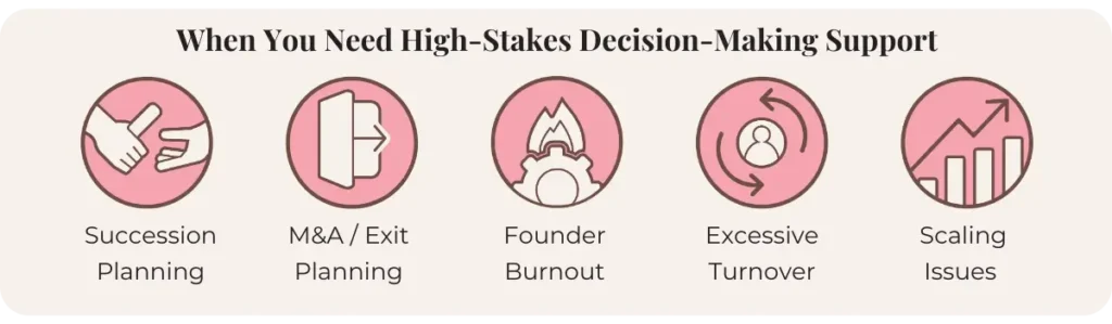 Perfect for: Founders facing scaling issues, excessive turnover, burnout, M&A/exit planning, succession planning, or high-stakes operational decisions.